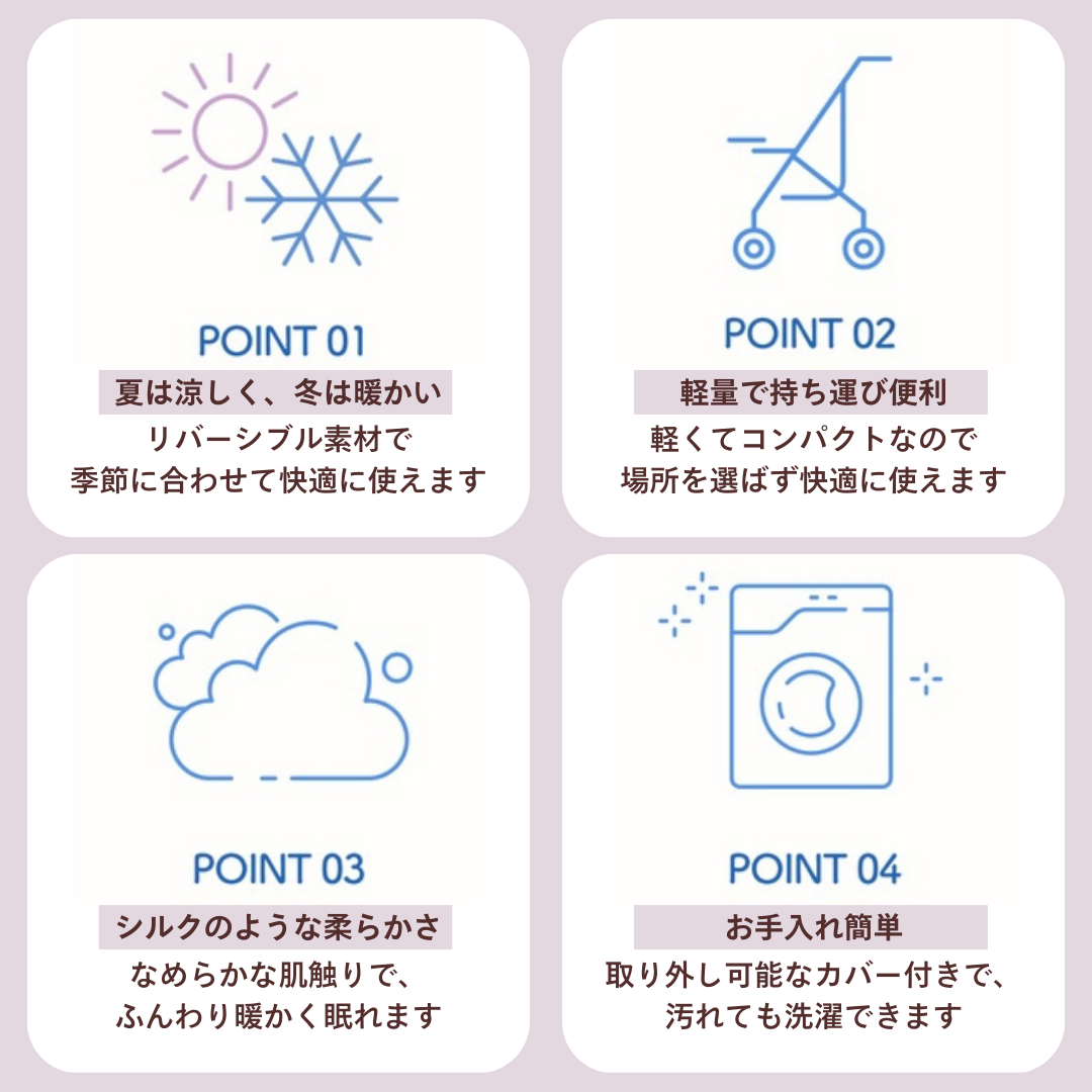 軽くて持ち運び簡単なリバーシブルお布団は、場所を選ばず快適に使えます。
