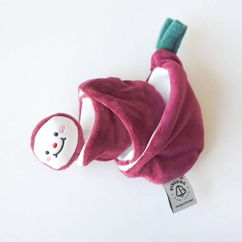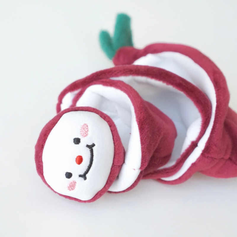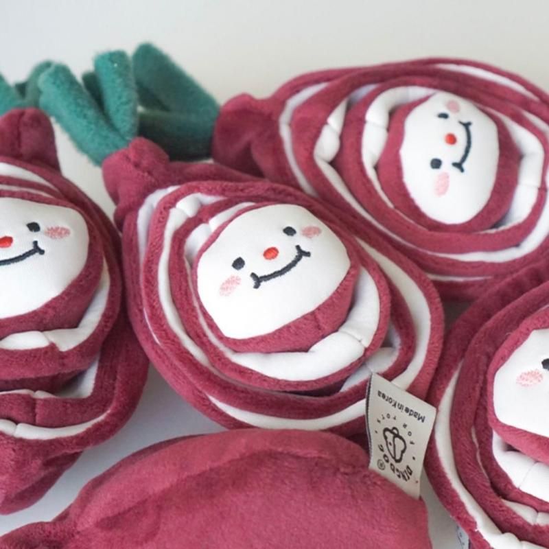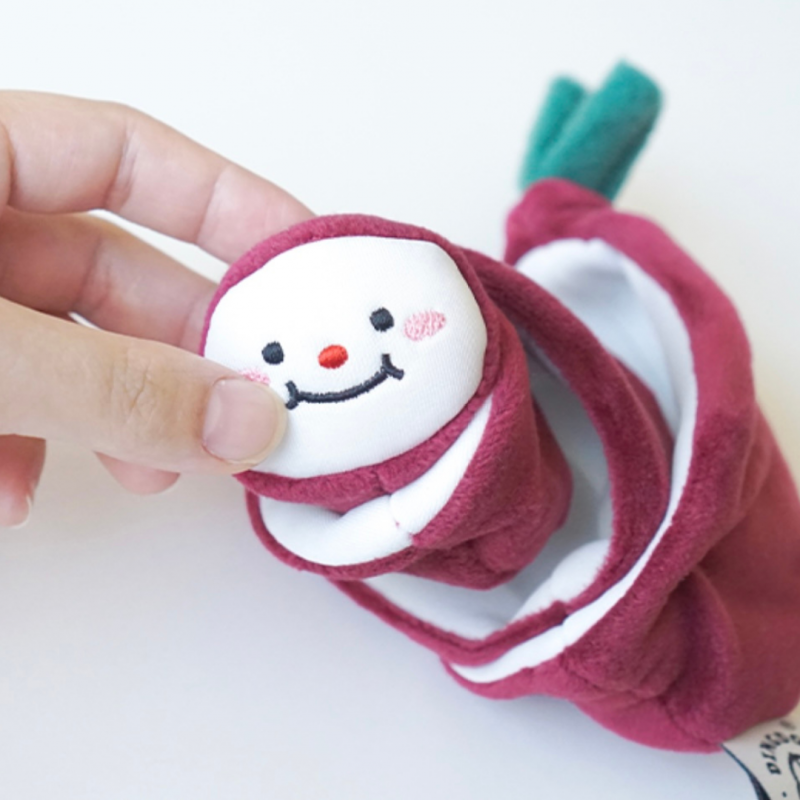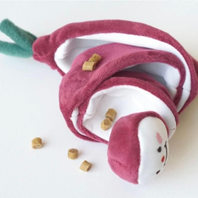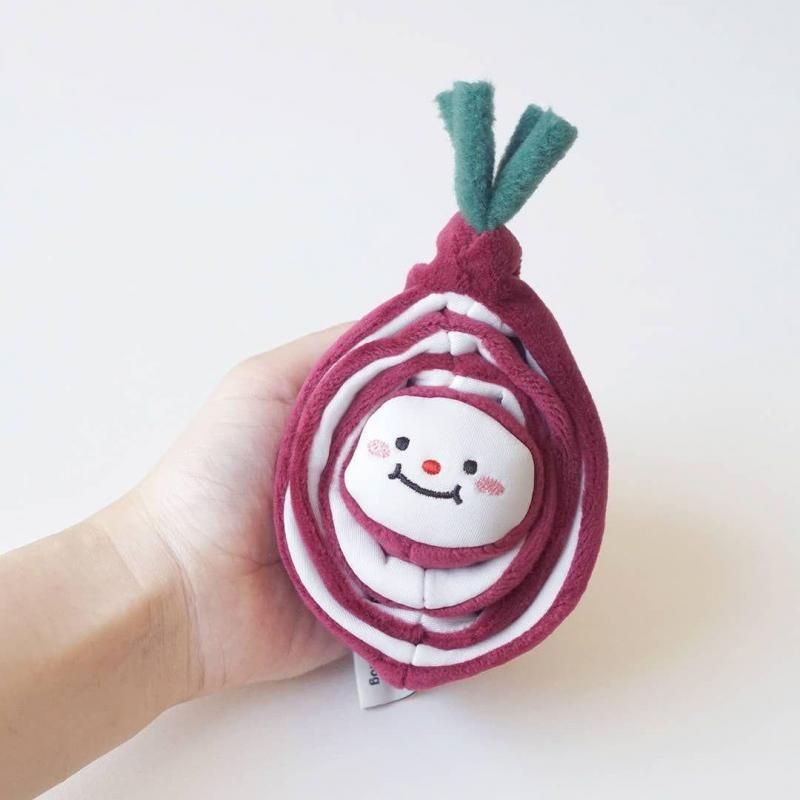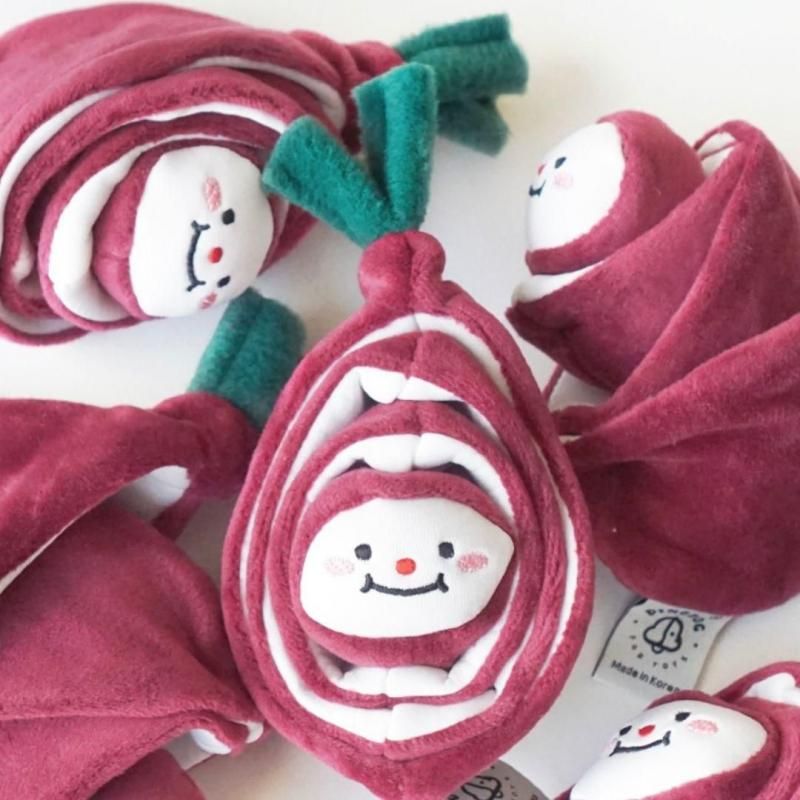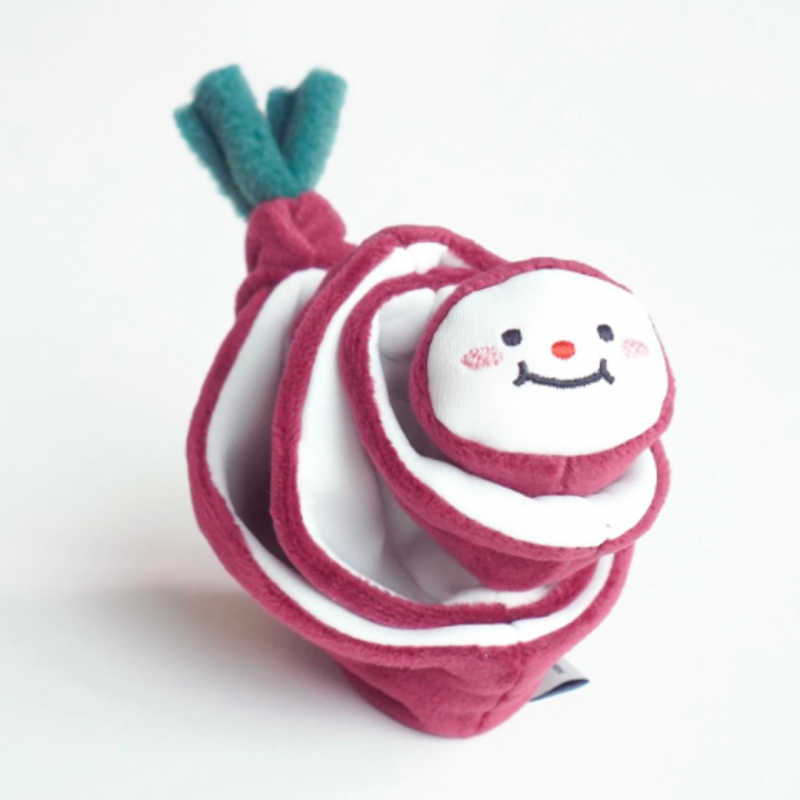 シャカシャカ音と鳴き笛、そしておやつ探しの楽しさを詰め込んだ知育ノーズワークトイ「レッドオニオン」は、見た目も可愛らしいレッドオニオン型のトイ。
