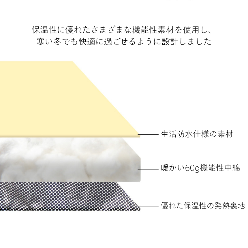 ◎冬の風にも負けない発熱生地を使用。愛犬の体から発生する熱を反射して保温性を高め、優れた通気性で湿気を逃す機能性素材です。