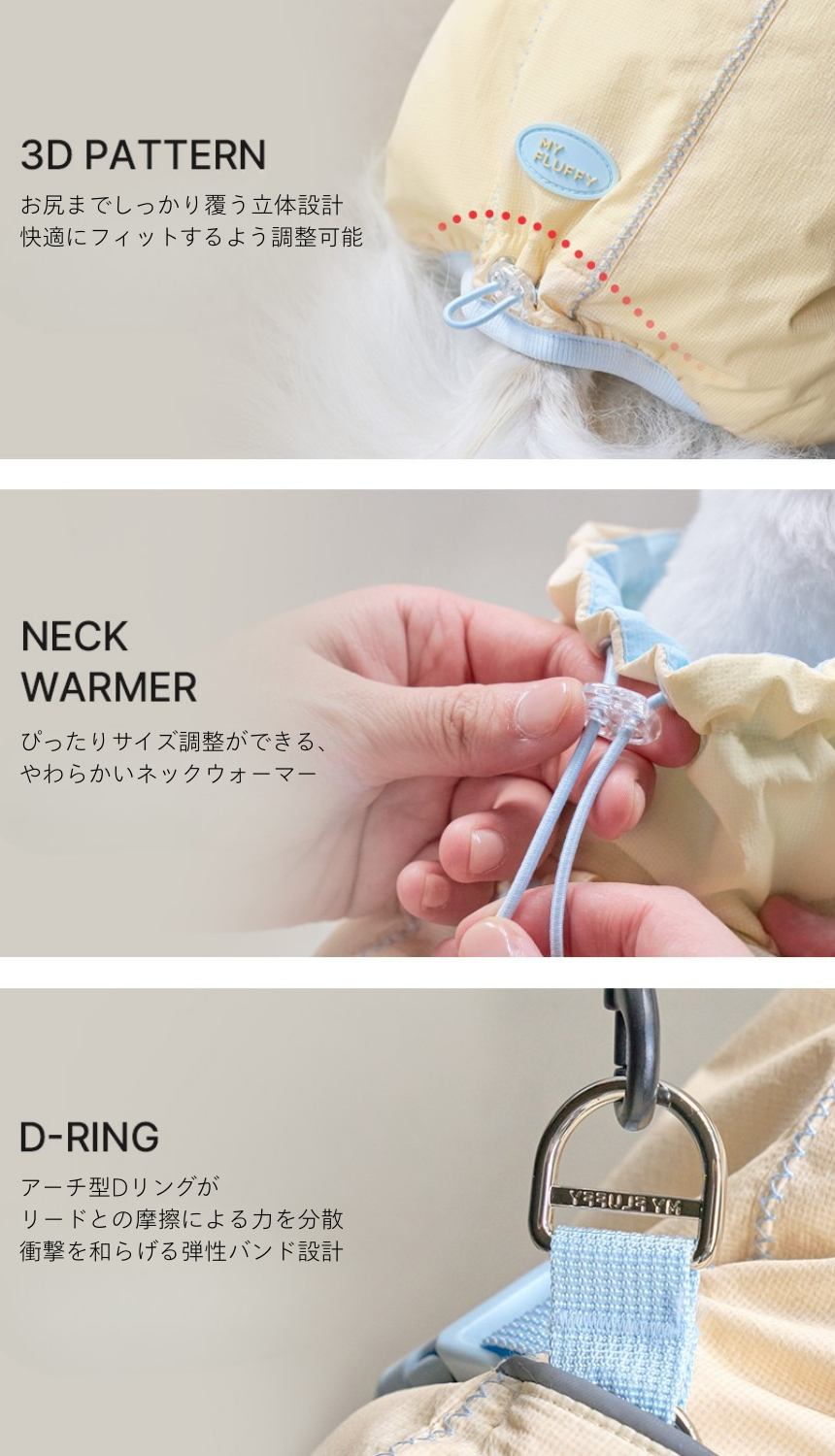 MY FLUFFY自社特許の衝撃防止バンディング機能を搭載したシグネチャーハーネスダウン
