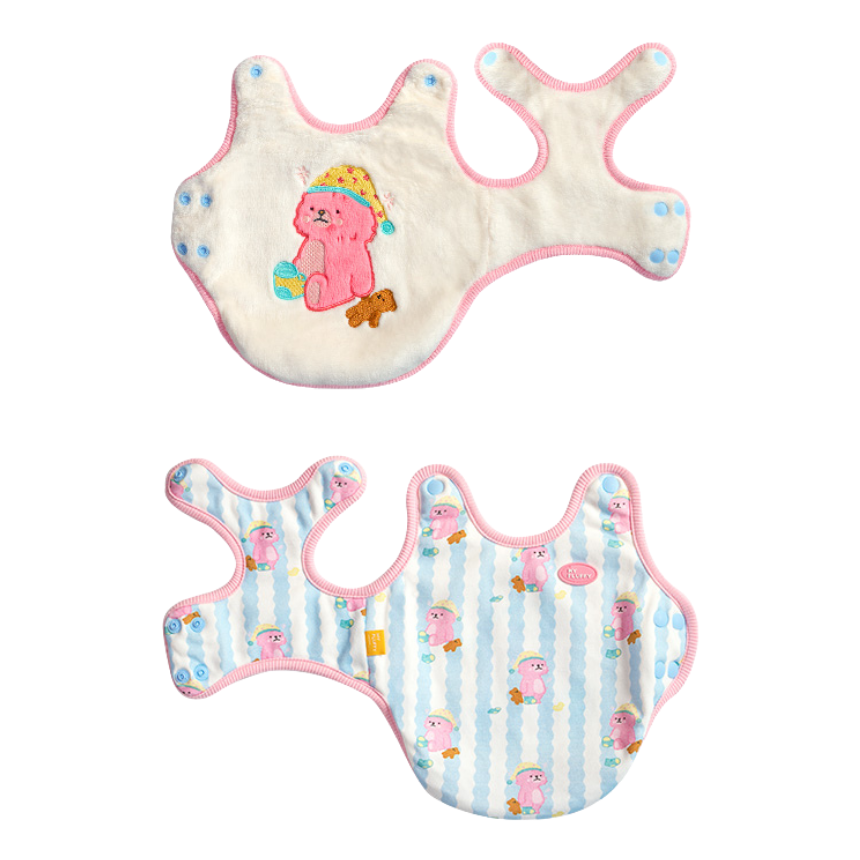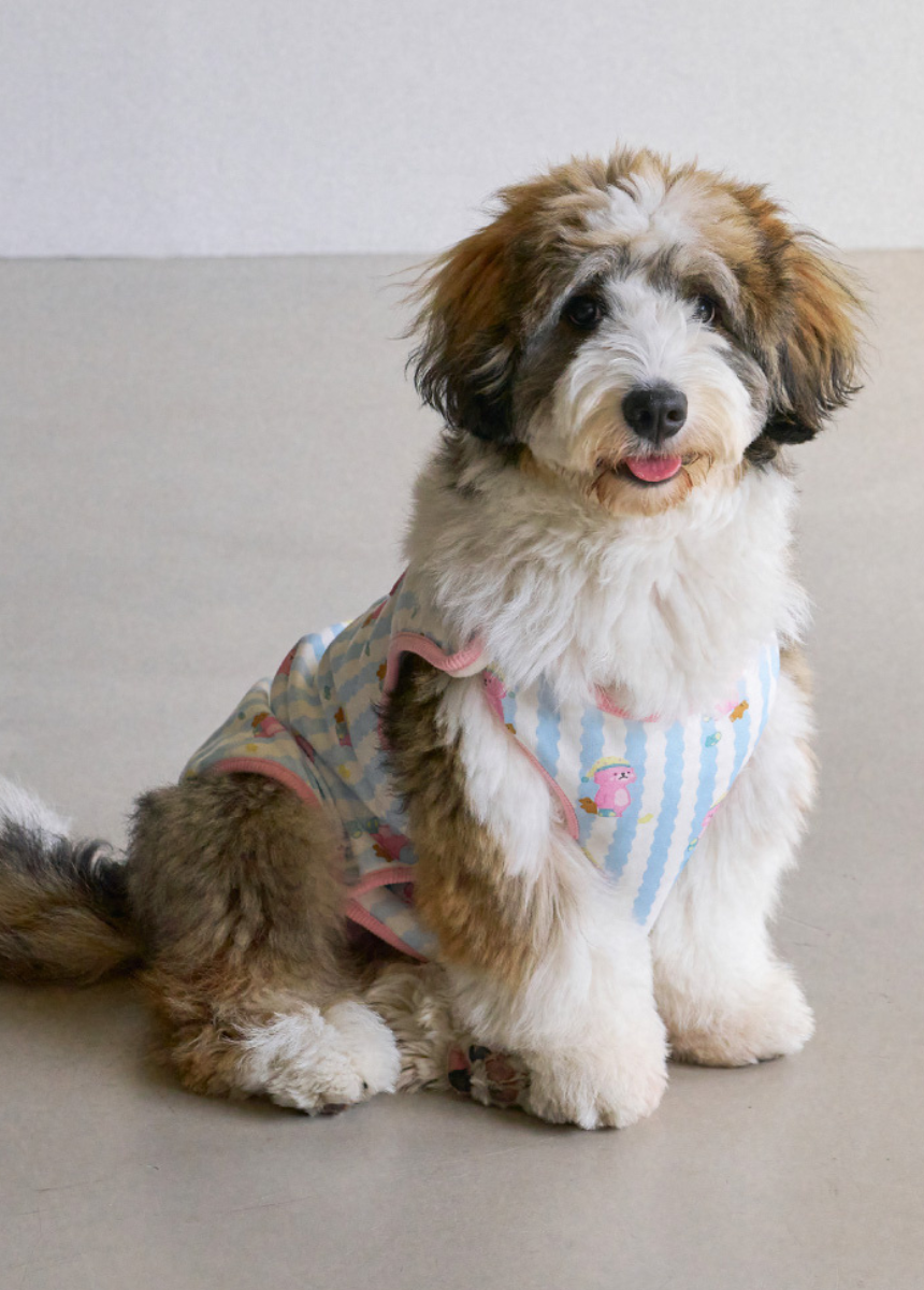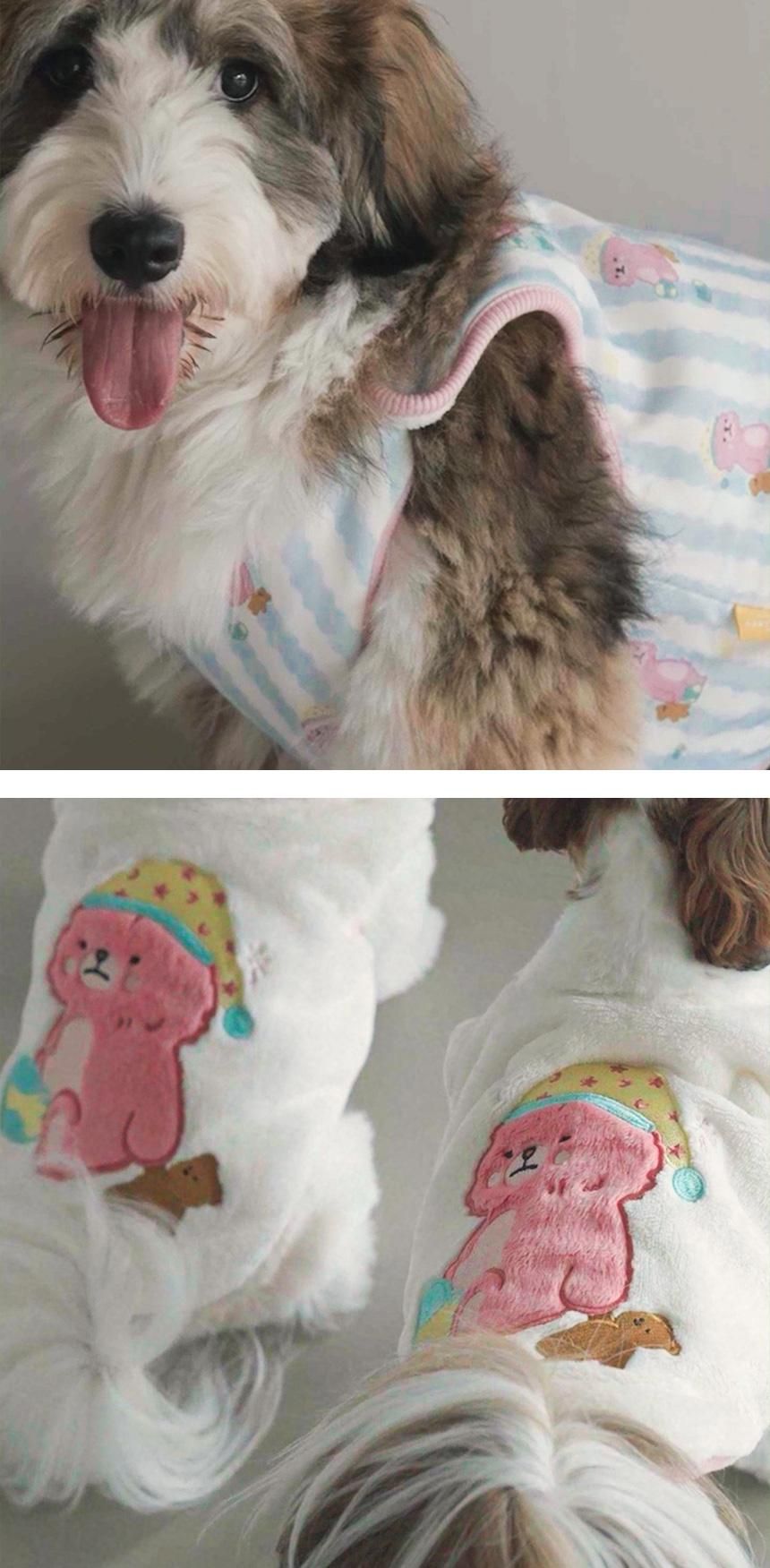 アップリケで質感を表現した可愛らしいイラストに、ベビームードのストライプパターンを組み合わせ、愛犬愛猫の可愛さを一層引き立てます。