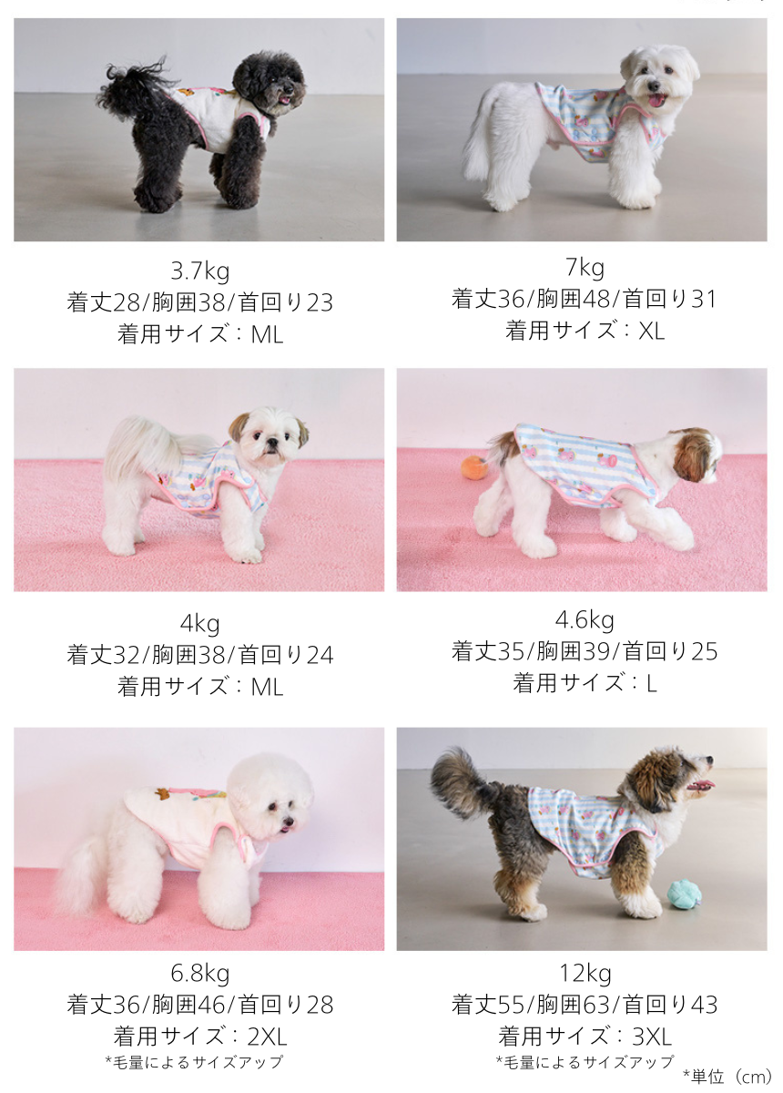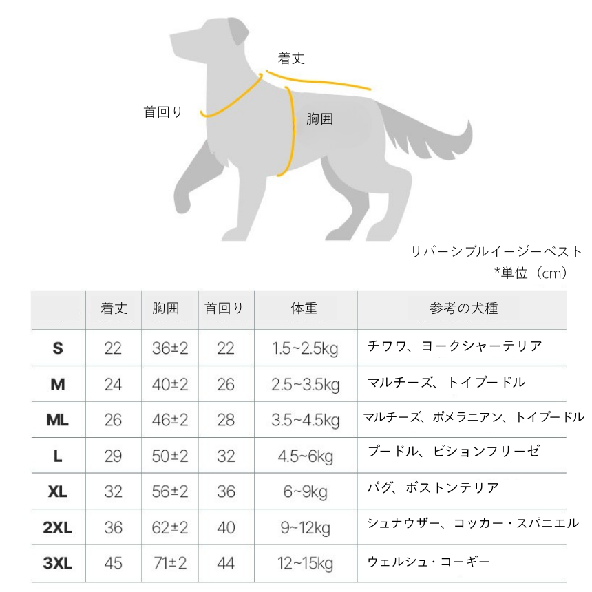 ・ペットの背丈、胴回り、首囲など体型を考慮してサイズを選んでください。